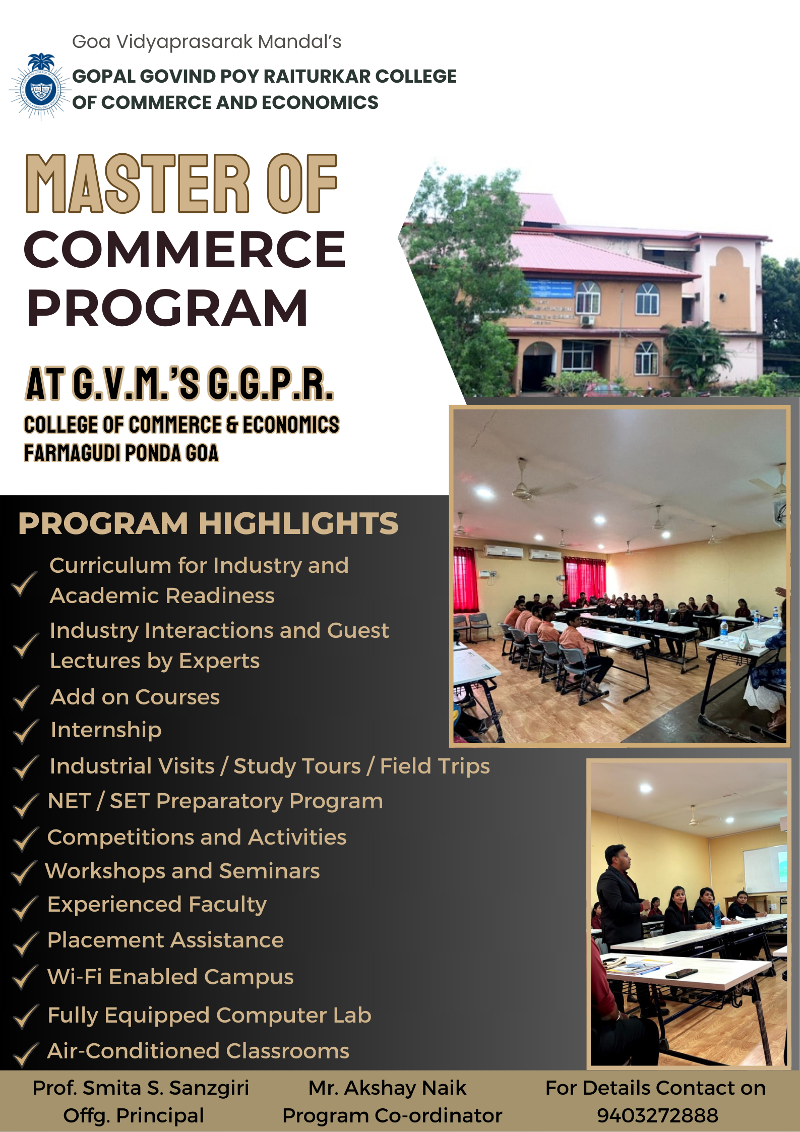 The College started the two year full time Post Graduate course in Commerce from the academic year 2008-09 which is affiliated to Goa University. This was done keeping in view the demand from the undergraduate students of the college. who wanted to pursue post graduation in the field of Commerce and to cater to the need of aspiring students in the nearby rural areas. The highlight of the M.Com course syllabus is the selection of electives which has been done carefully to go with latest trends in the industry and to keep pace with ever changing times of service sectors. The subjects offered are in the lieu with current industry norms. The M.Com course undergoes frequent revision of syllabus depending on the need of market. The pedagogy combines lectures,seminars,assignments, Case studies , Group Discussion, Field Trips, study tours and interaction with industry experts. Each Student is encourage to inculcate reading habits, participate in Classroom discussions, undertake research, learn new software that will help them in their research and present research paper in various national and state level seminars. The Classroom environment is adapted with interactive sessions and complemented with the use of multimedia lectures making the subject interesting and learning process more effective. The lecture is conducted as prescribed norms of Goa University.
